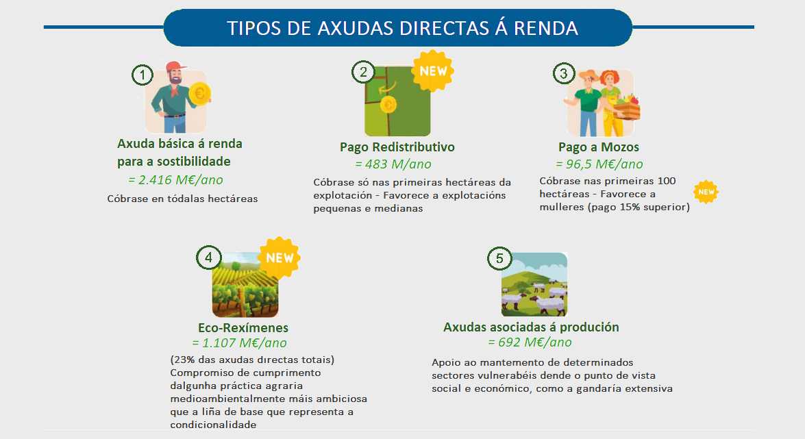 - Agricultores beneficiarios de axudas directas no ano anterior, que percibiron menos de 5.000€, así como os cesionarios de cesións de axudas con cesións de explotación, ou cambios de titularidade por herdanza, xubilacións (cesionario ata 3º grao de cedente), cambios de denominación, fusións ou escisións, si o cedente percibira menos de 5000€, antes da aplicación das penalizacións ou exclusións derivadas dos controis de subvencionalidade ou de condicionalidade”.