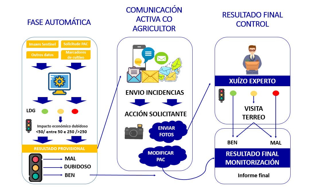 A comunicación cos beneficiarios de axudas da PAC é fundamental no contexto de máxima automatización que supón a monitorización. Esta debe ser rápida e efectiva para permitir comunicar luces amarelas e vermellas requirindo o aporte de información ou evidencias adicionais en forma de fotografías xeo etiquetadas ou ben a modificación das parcelas comunicadas na súa solicitude única co obxecto de corrixir os posibles erros detectados nos prazos habilitados ao efecto. Evitando así reducións e sancións nos pagos derivados de erros declarativos.